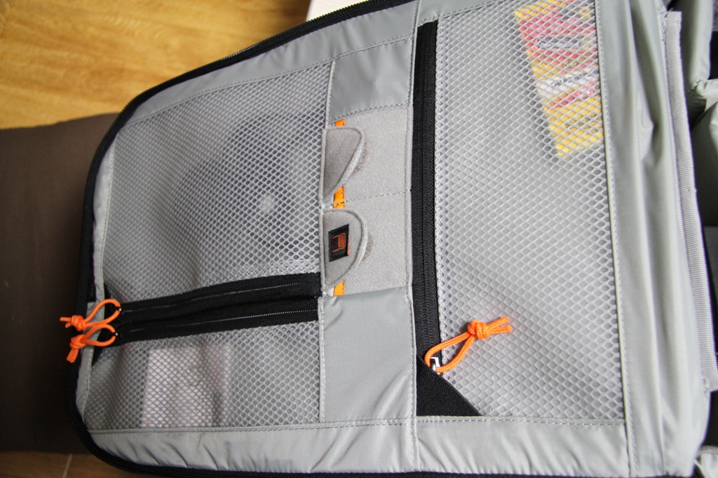 更に開いてカメラを入れるところには、このようなアクセサリー関係を入れるポケットがついている。電池やレリーズ、レンズティッシュをとりあえず入れてみた。