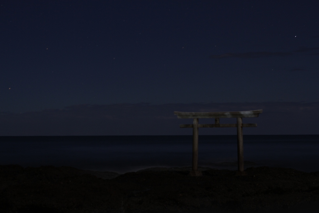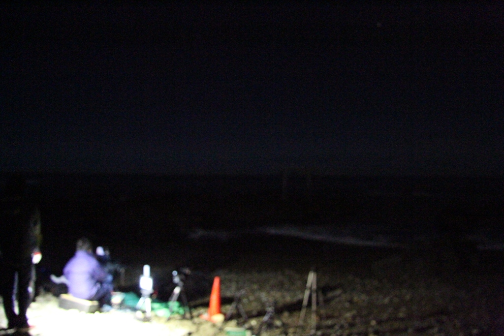 大洗の海岸に着いたのは、確か3:45頃だったと思う。しばらく真夜中の海岸を歩いたから、撮影ポイントに着いたのは4:00頃だったかもしれない。