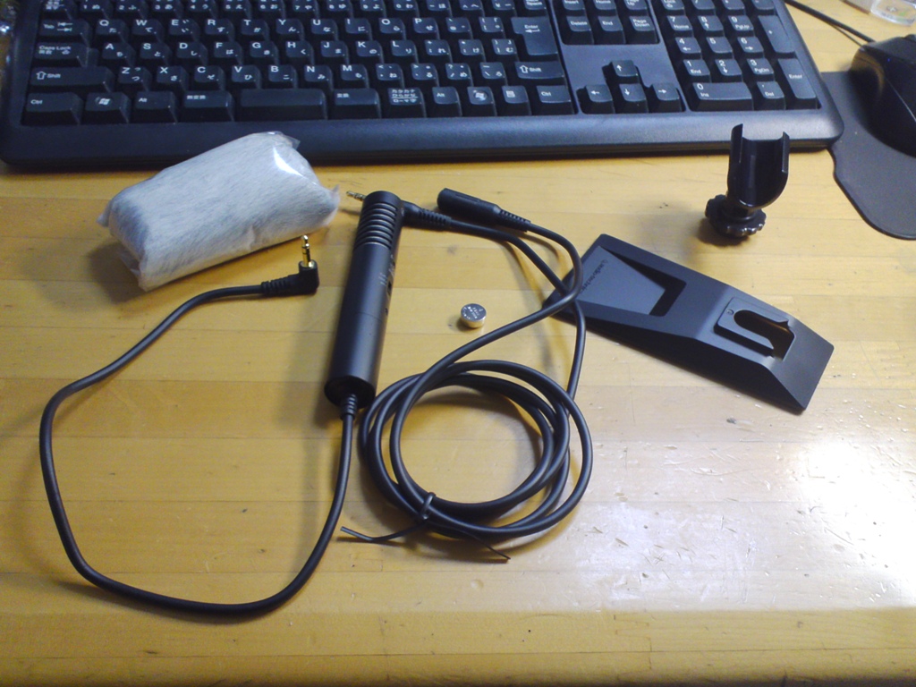マイク本体、マイクスタンド2種類、延長ケーブル、ウィンドマフ、ボタン電池。